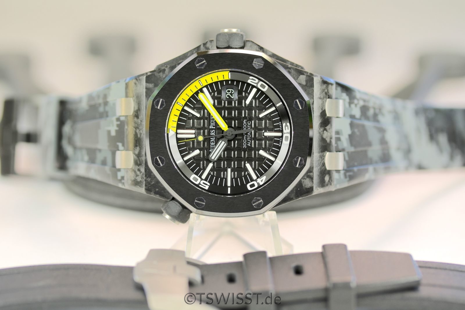 Wunderbare und seltene Uhr- AP Diver Carbon in 42mm. Box und Papiere (LC 100) vorhanden. Kaum getragen. Die Uhr wurde bei AP aufgrund eines Uhrwerksfehlers in 2014 komplett geserviced und läuft einwandfrei. Dokumentation vorhanden und wird mitgeliefert.