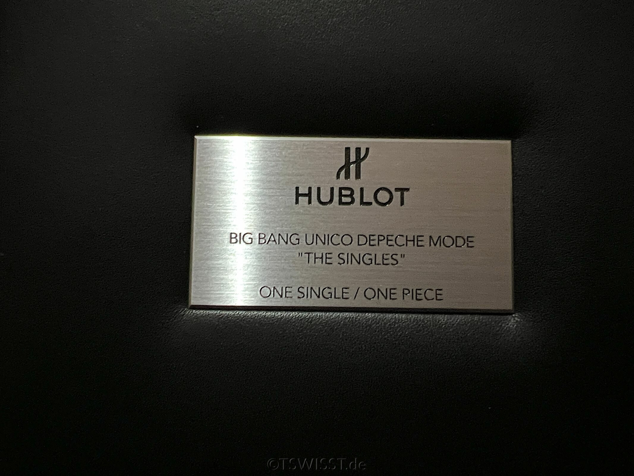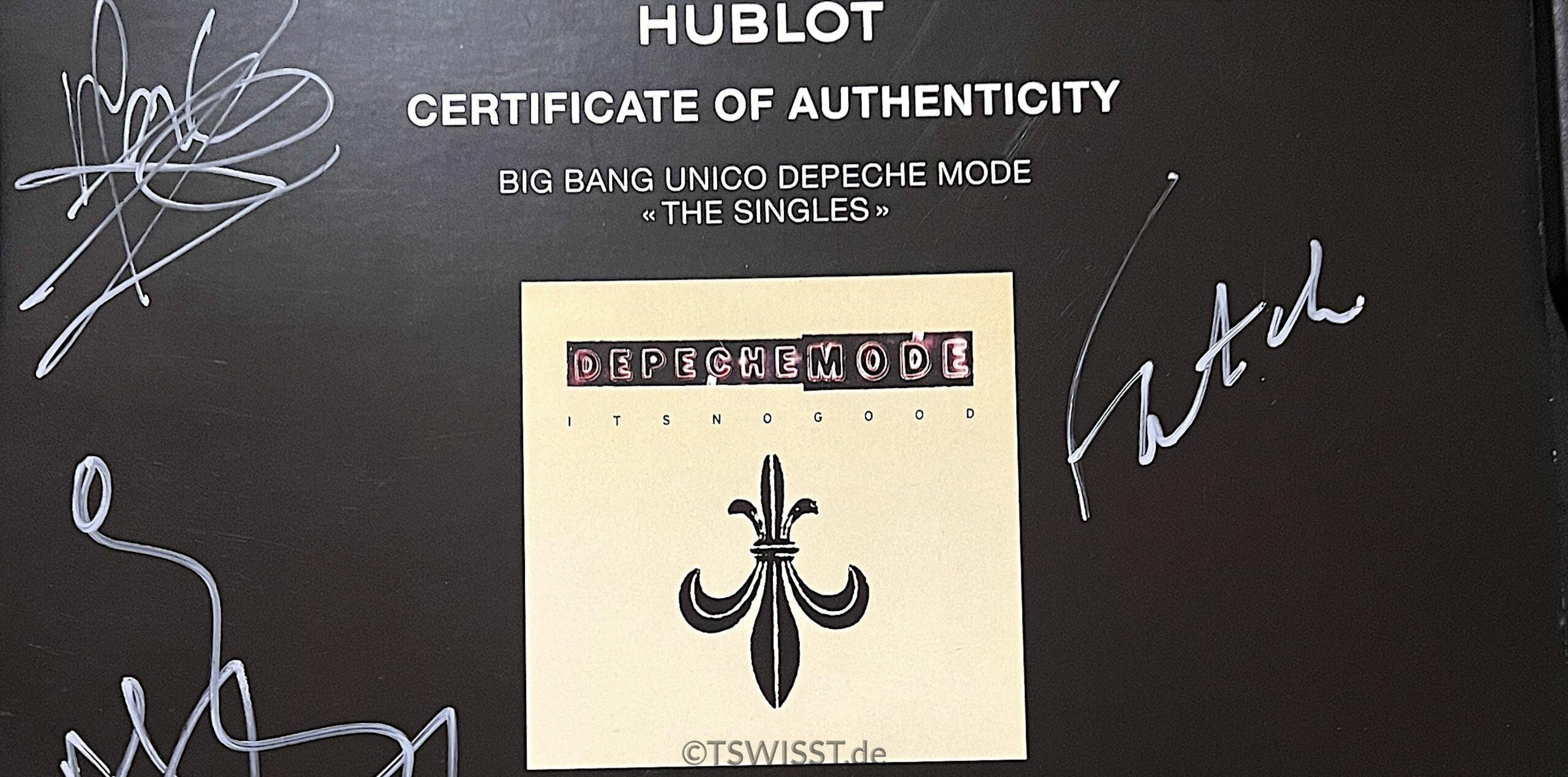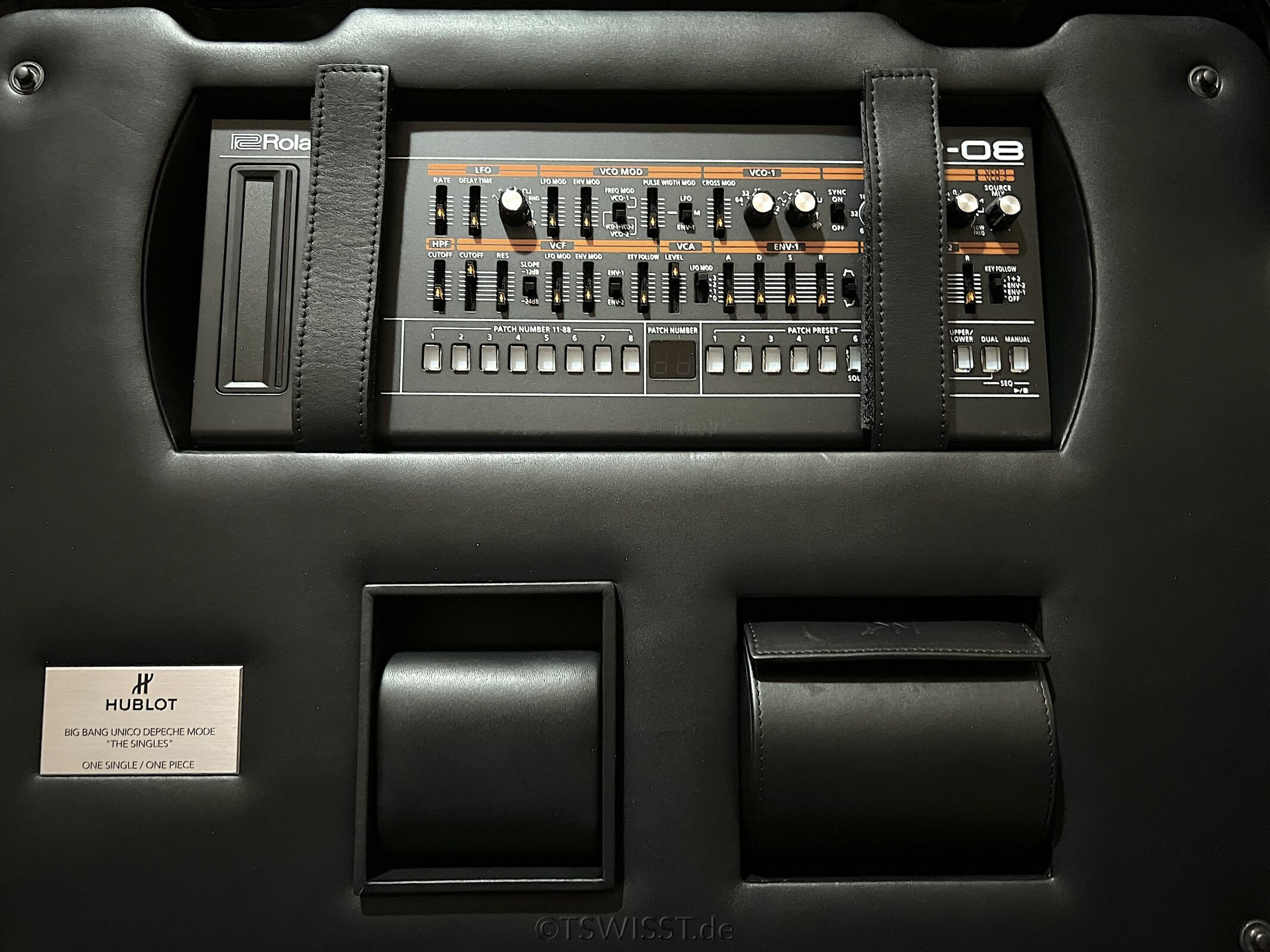 A real unicorn- Hublot Big Bang single piece 1/1 in collaboration with Depeche Mode. Do not mix with the mass „Limited Edition of 250 Depeche Mode“ – this is a true single piece! For each DM single Hublot issued ONE watch- this one is for single „It is no good“. All profit was spent for Charity water projects. This is a full set and unworn, see pictures. Included is the first buyer invoice (Retail 31000 Euros) as well as the big box with the Rimowa trolley, the Roland synthesizer- everything!