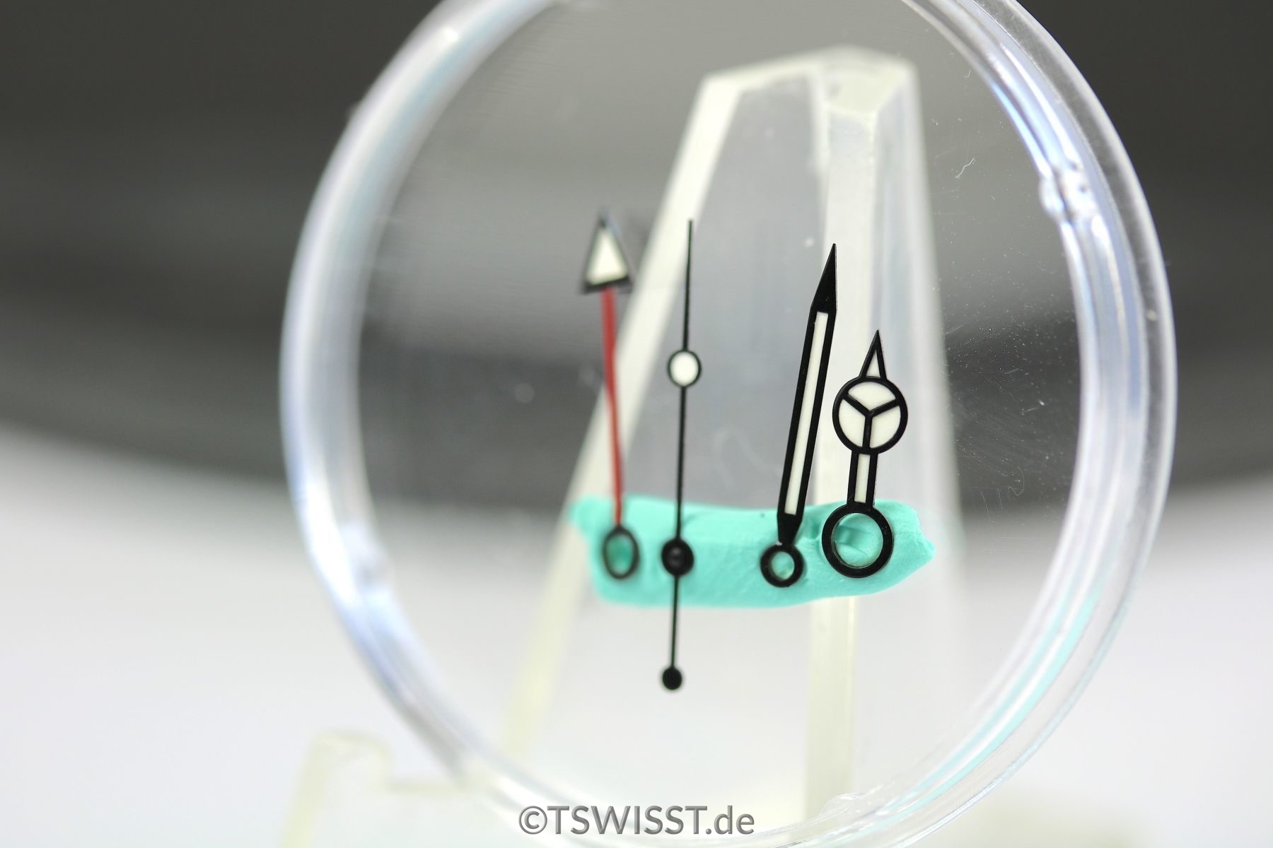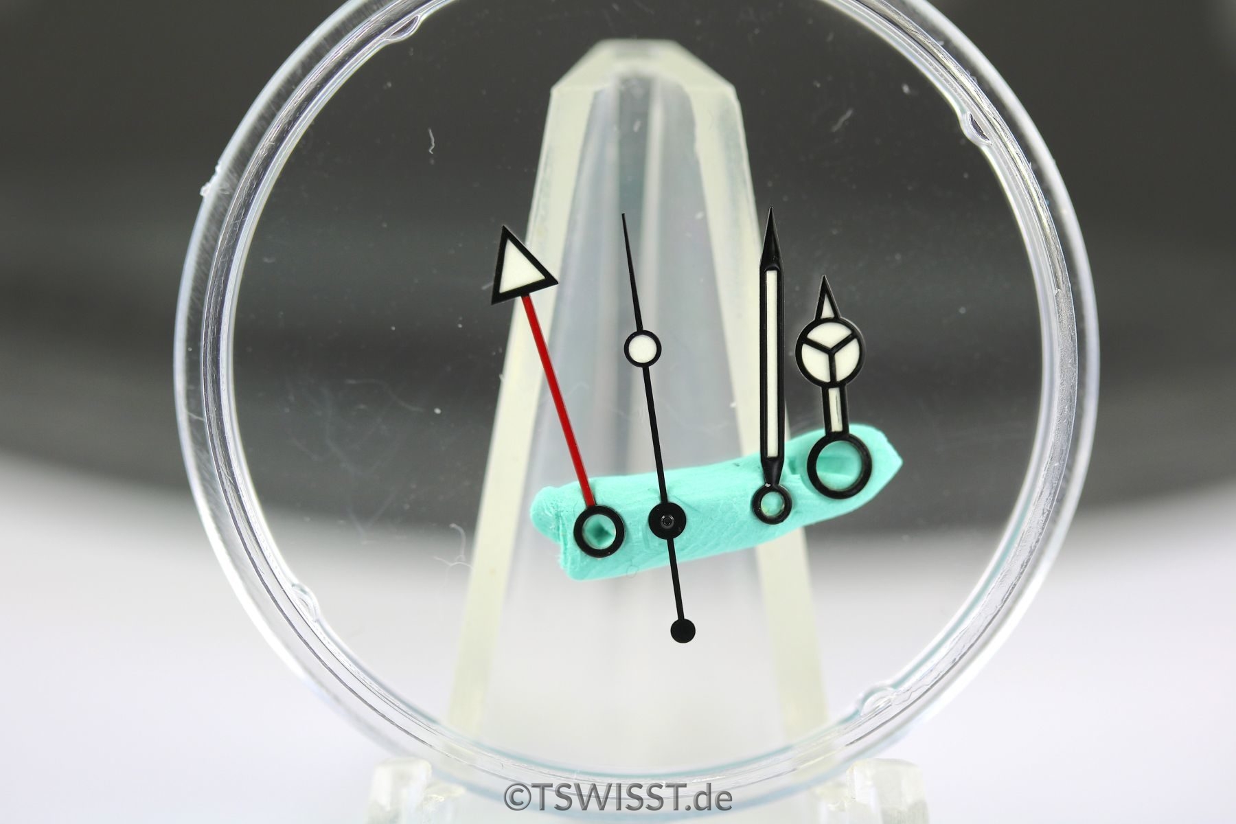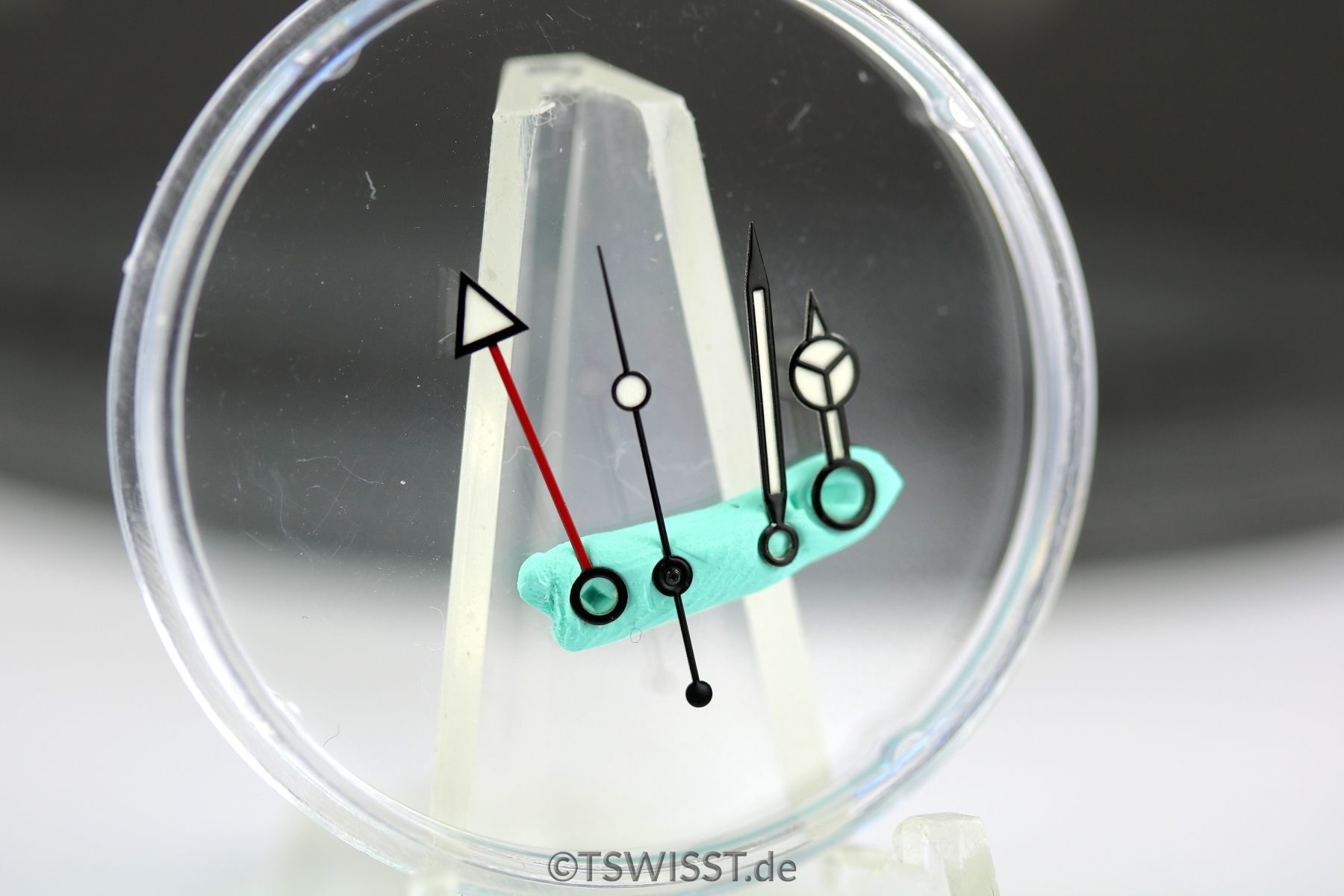 Rolex Zeigersatz für Explorer 16570 / 16550 für schwarzes Zifferblatt in sehr gutem Zustand mit minimalem Riss im Stundenzeiger, Lume ist Tritium.