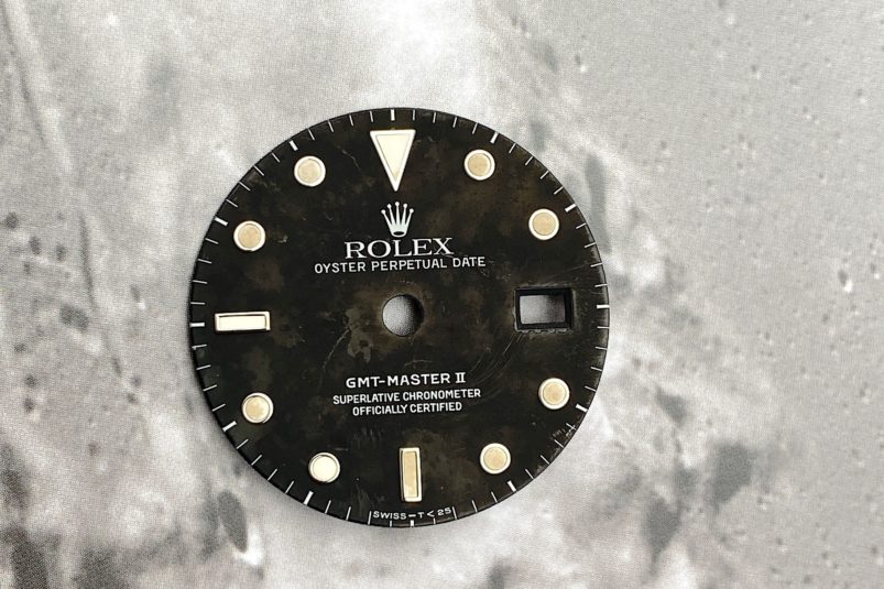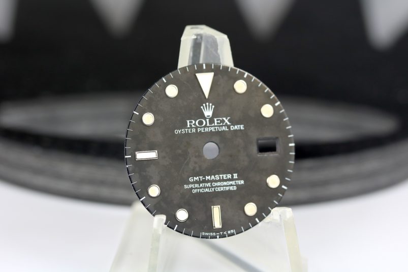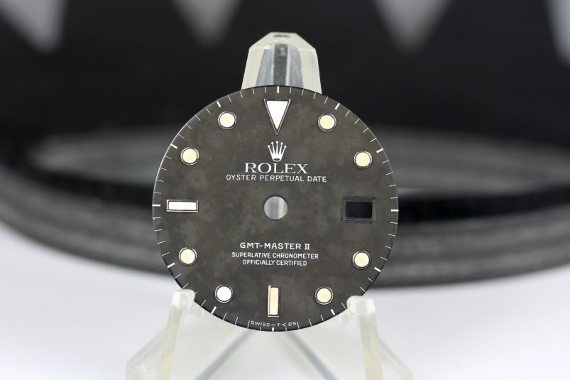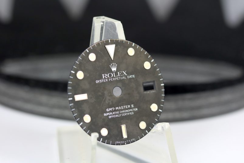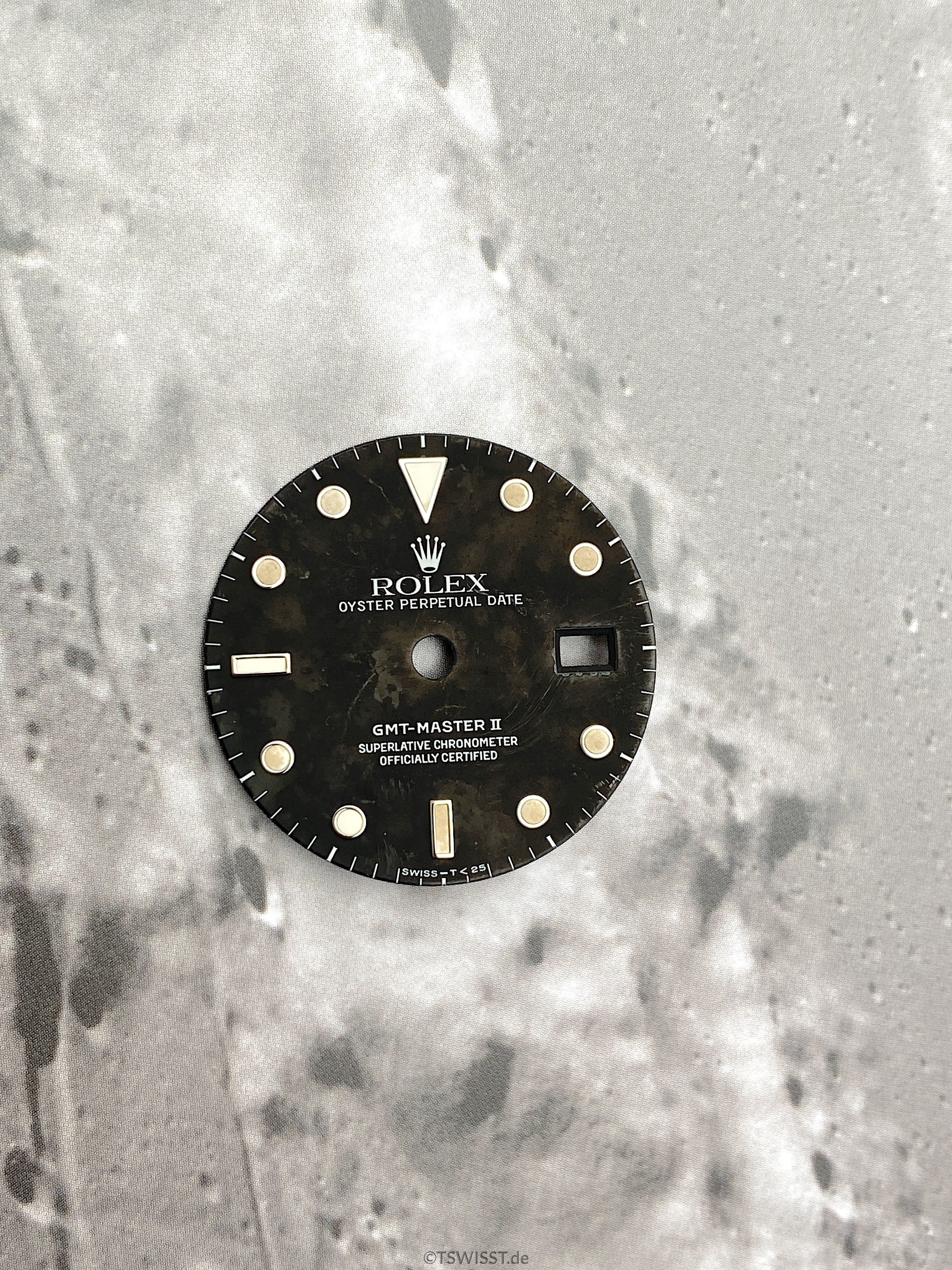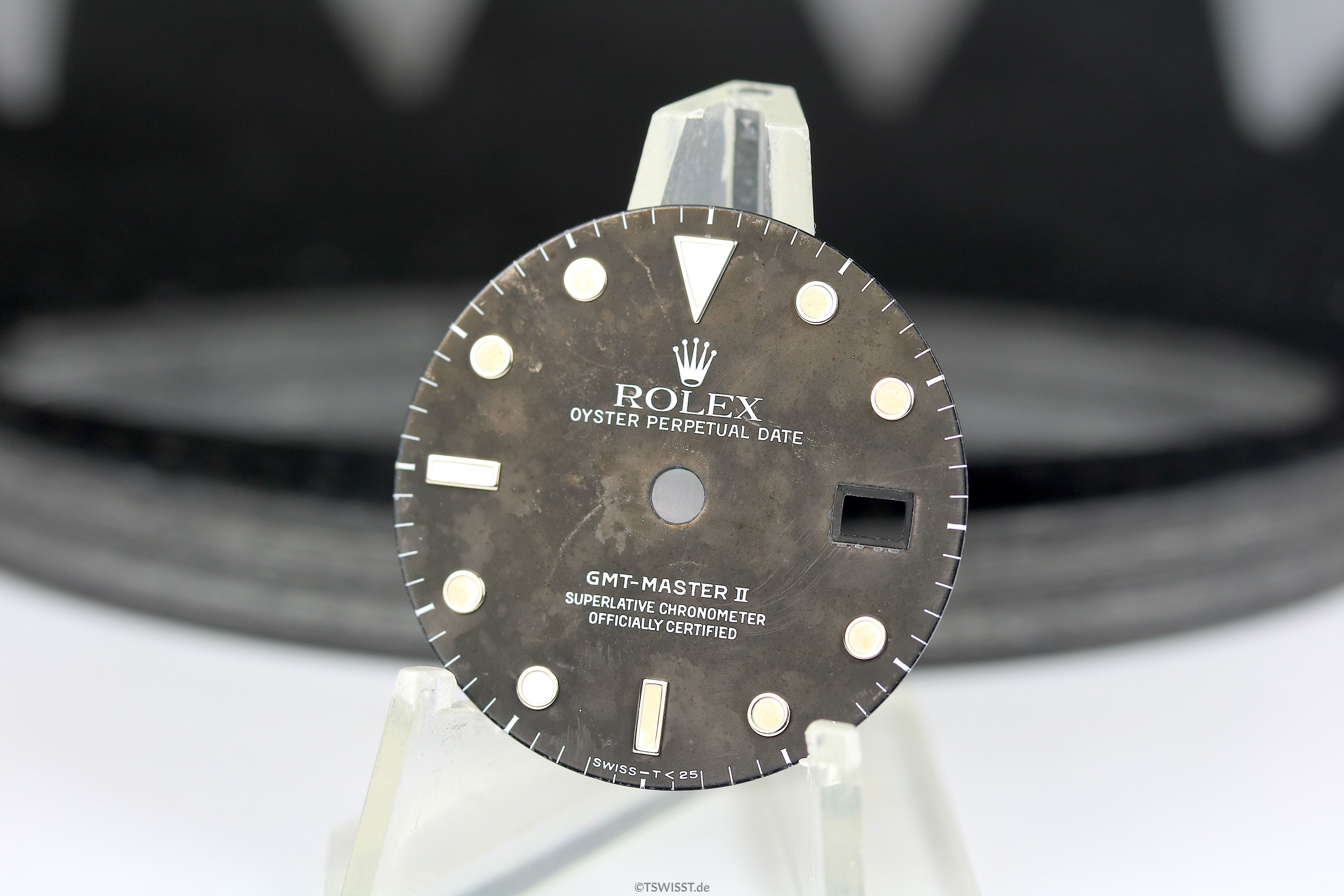 Rolex Zifferblatt faded tropical brown dial für GMT-Master II 16710 / 16700 / 16760 und andere in sehr gutem Zustand, Leuchtmittel ist Tritium. Über die Jahre ist der Lack des Zifferblatts verblichen und erscheint bei seitlichem Lichteinfall braun.