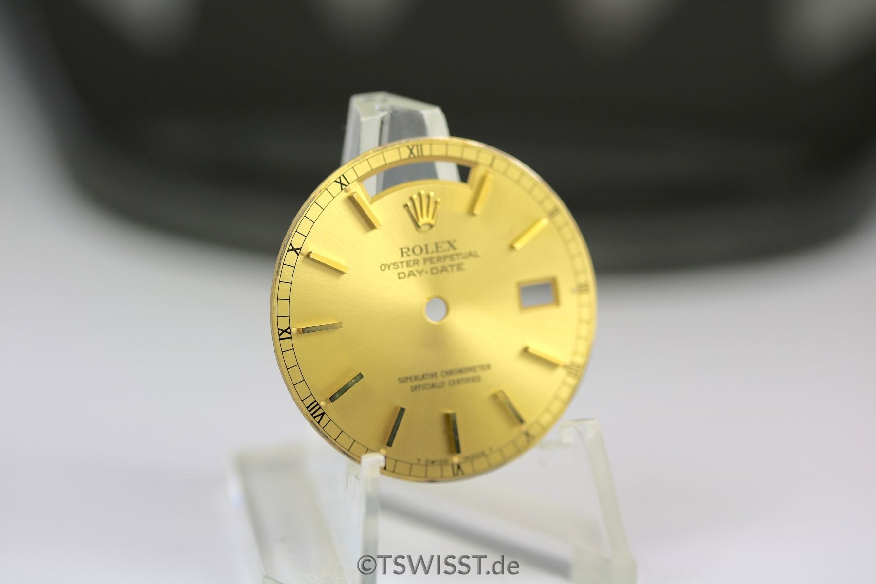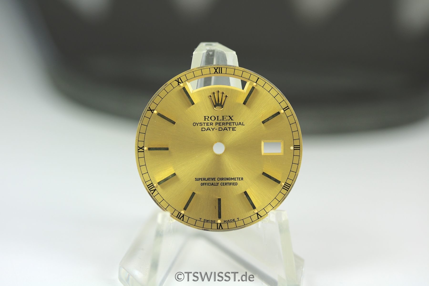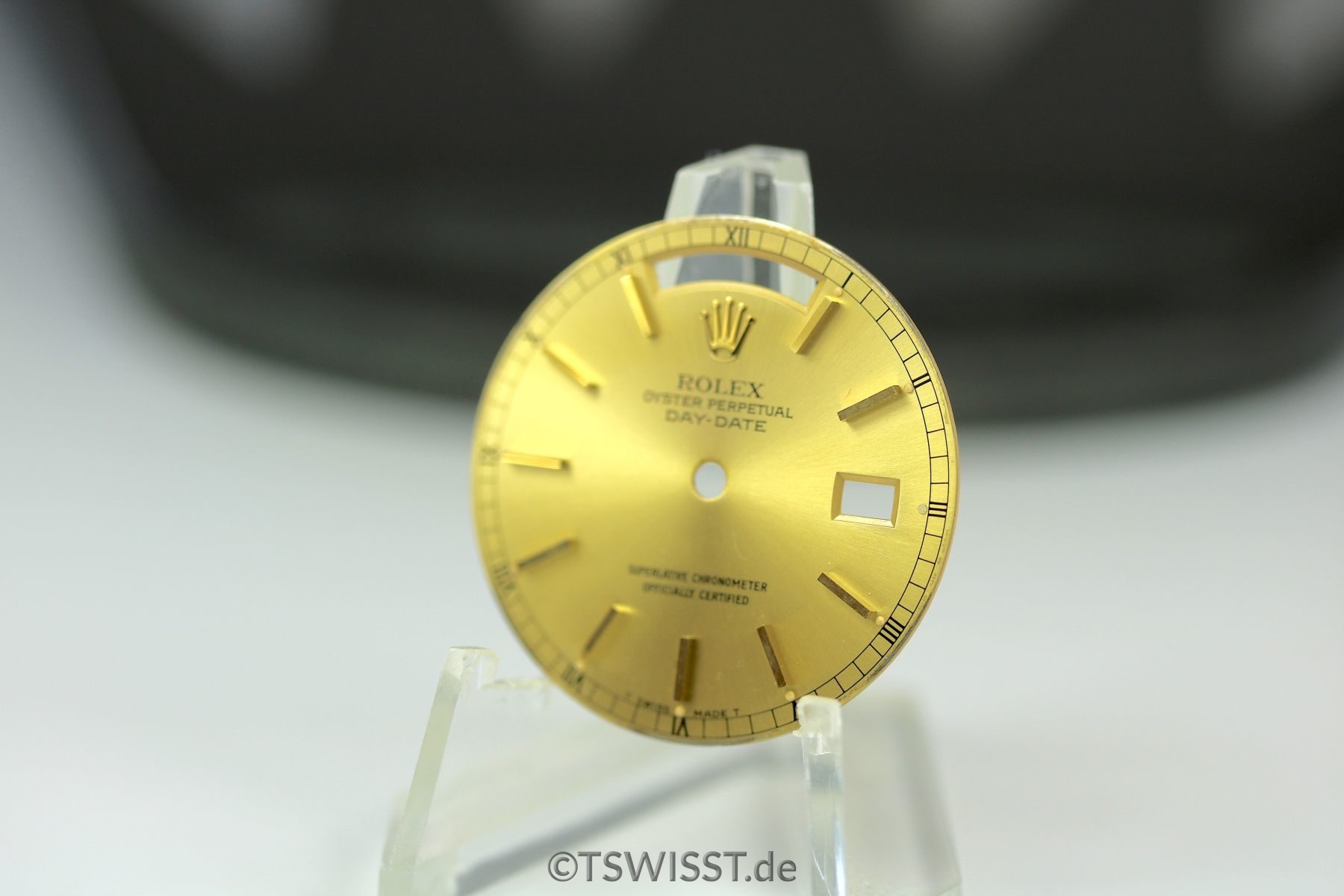 Rolex champagne index yellow gold dial for Day-Date 180*8 in schlechter condition with visible defects. Lume is tritium.