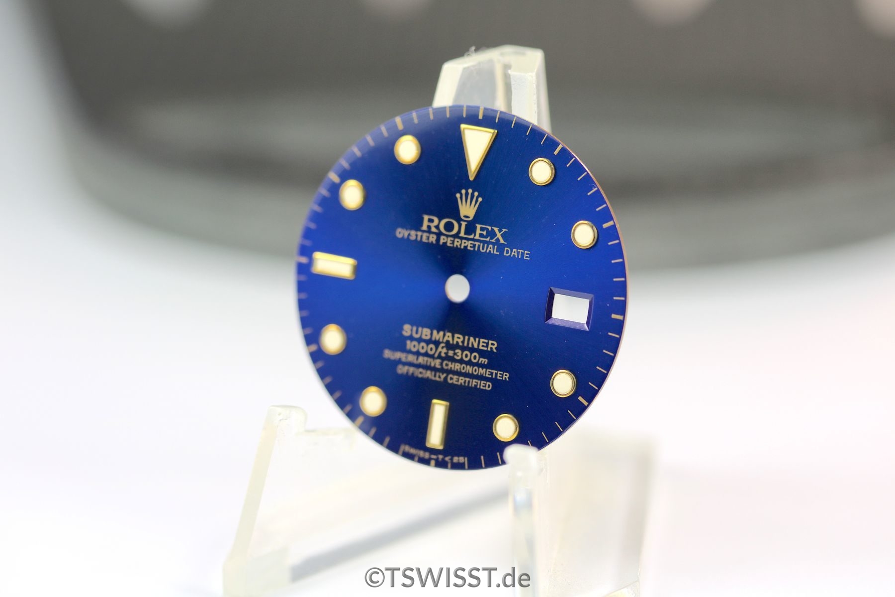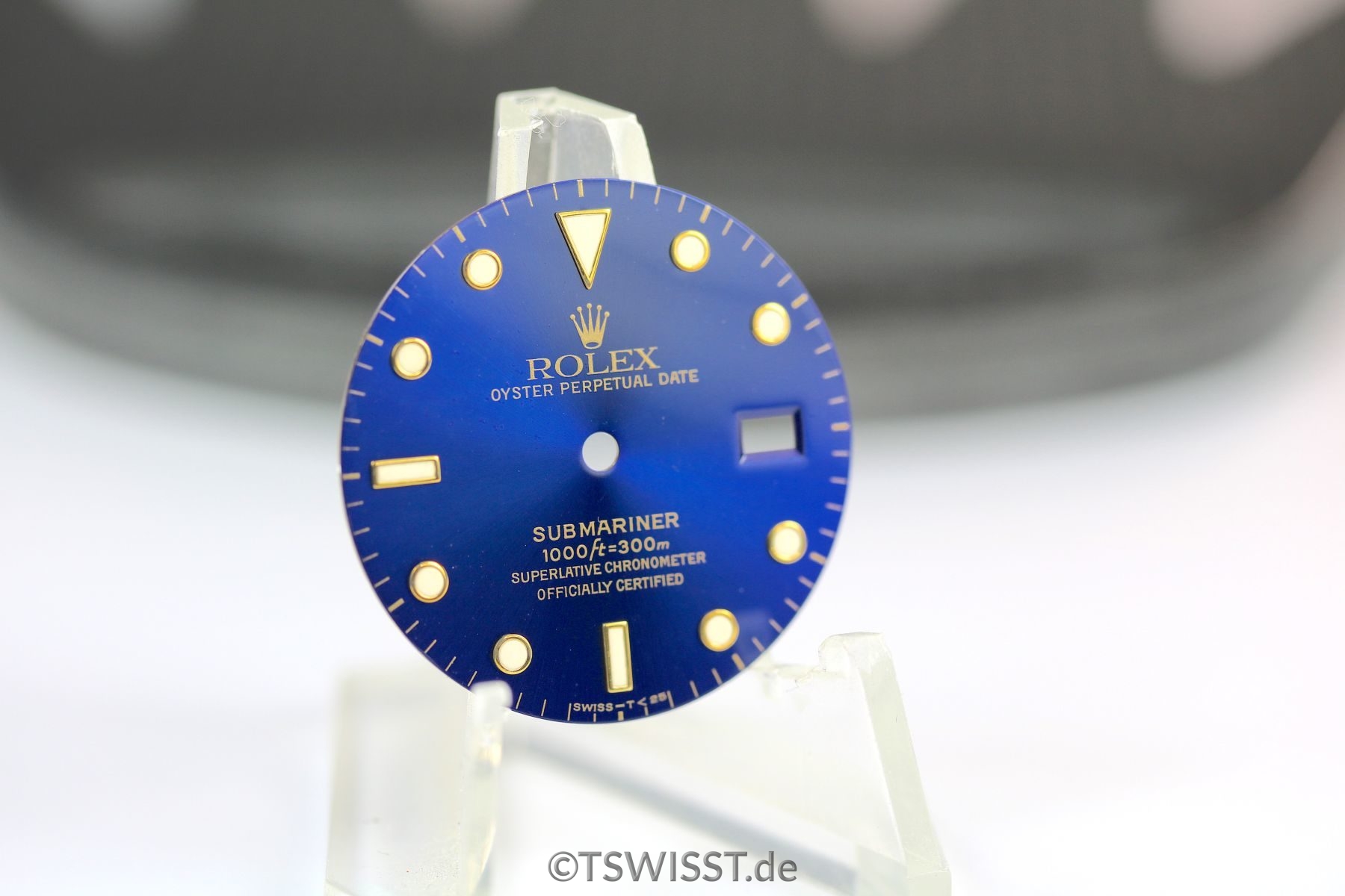 Blaues Rolex Zifferblatt für Submariner 16613/16618 und andere mit gelbgold Schrift in guter Erhaltung. Leuchtmittel ist Tritium.