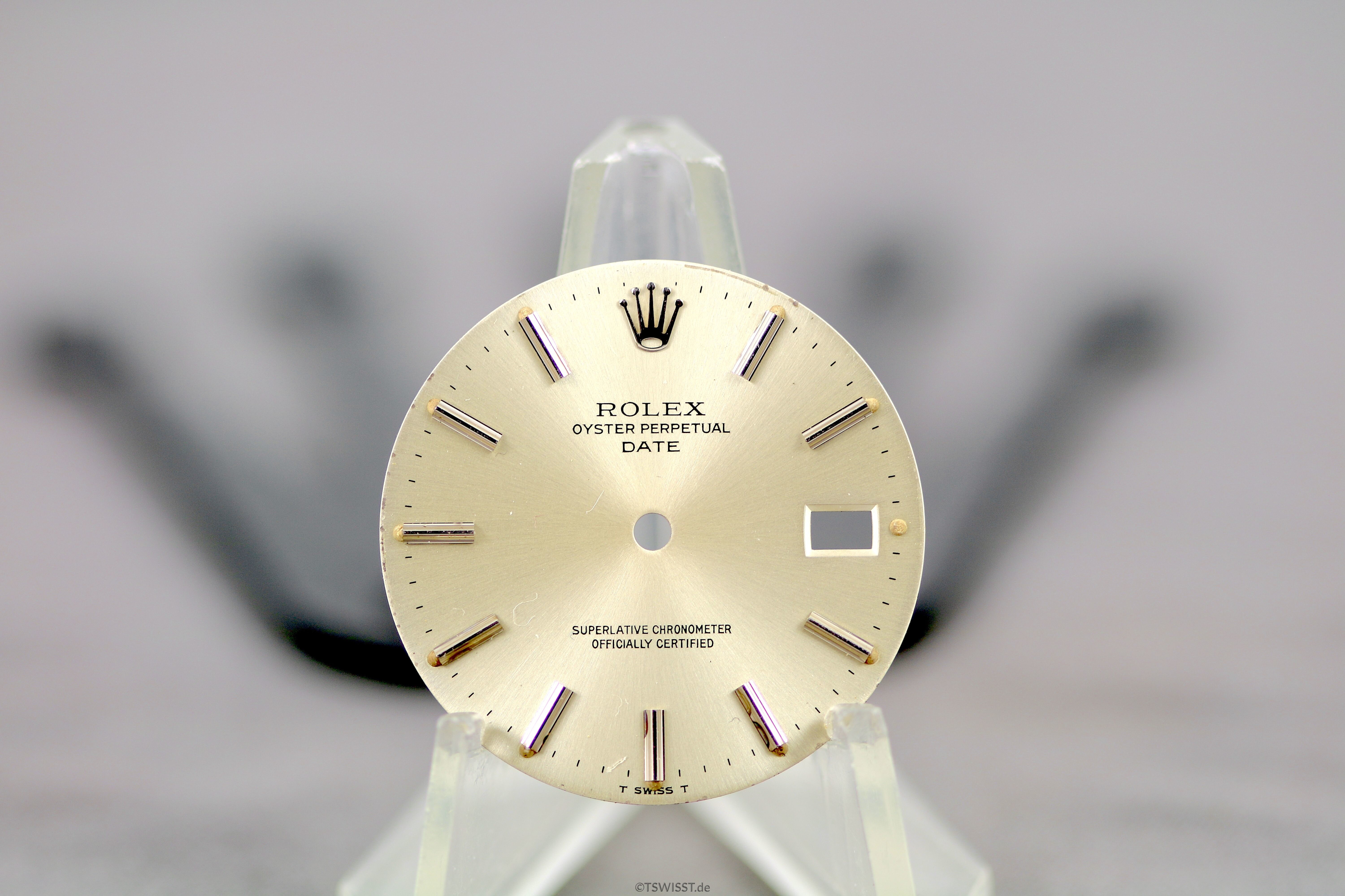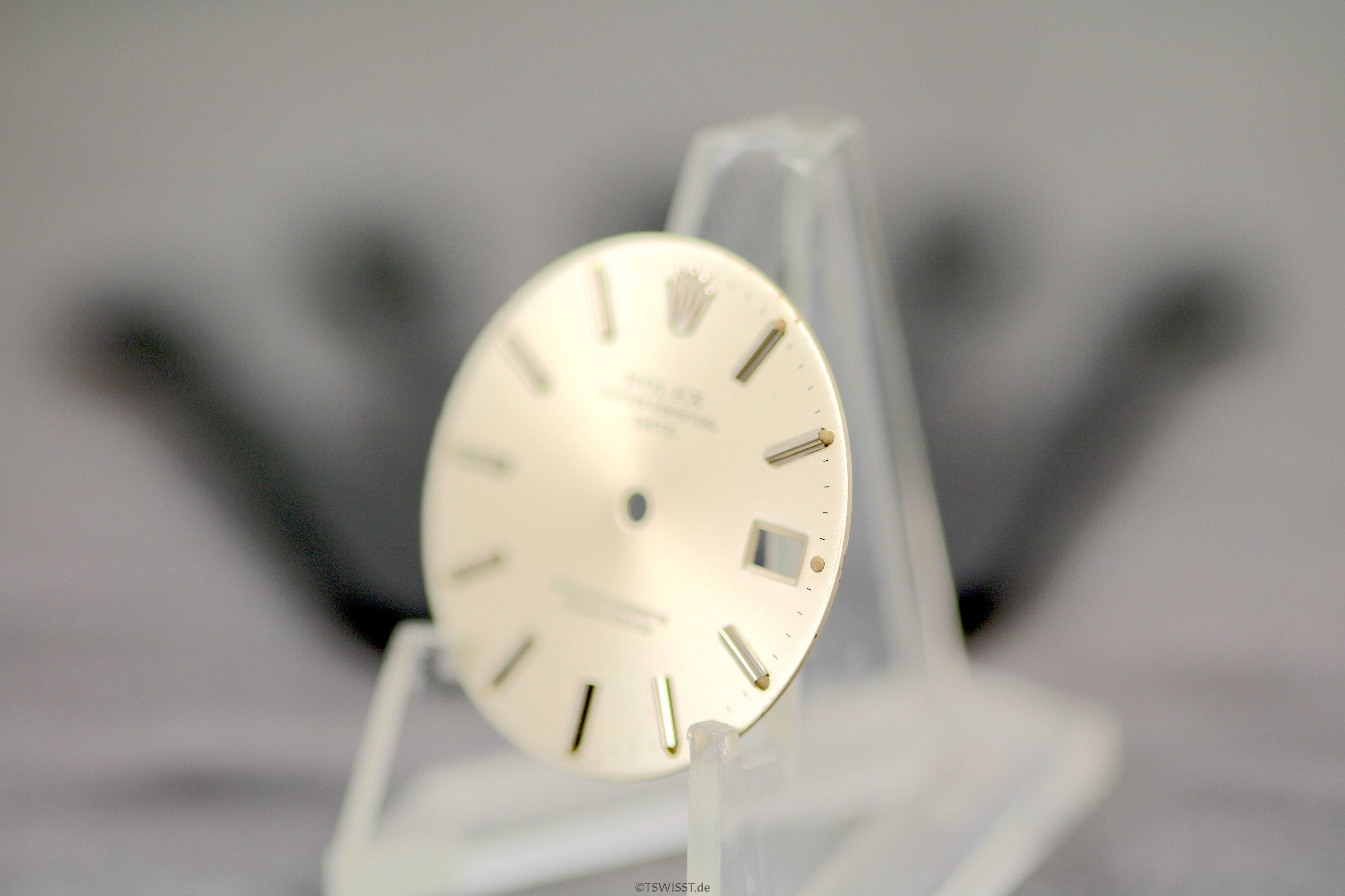 Rolex Zifferblatt für OP Date Index weißgold in akzeptabler Erhaltung, Leuchtmittel ist Tritium. Ein Haltefuß fehlt!