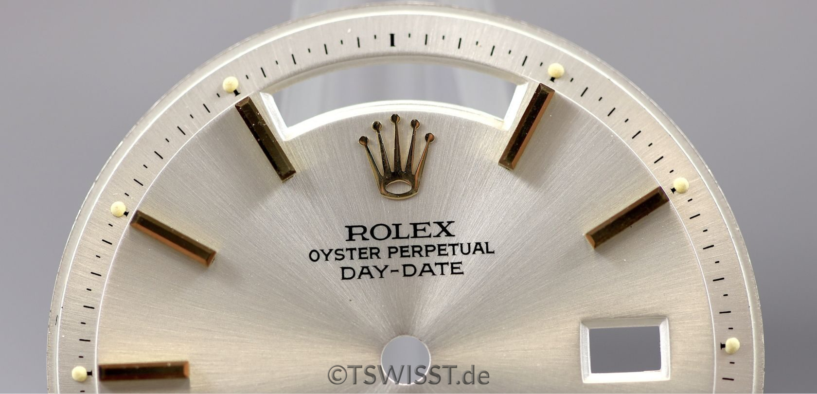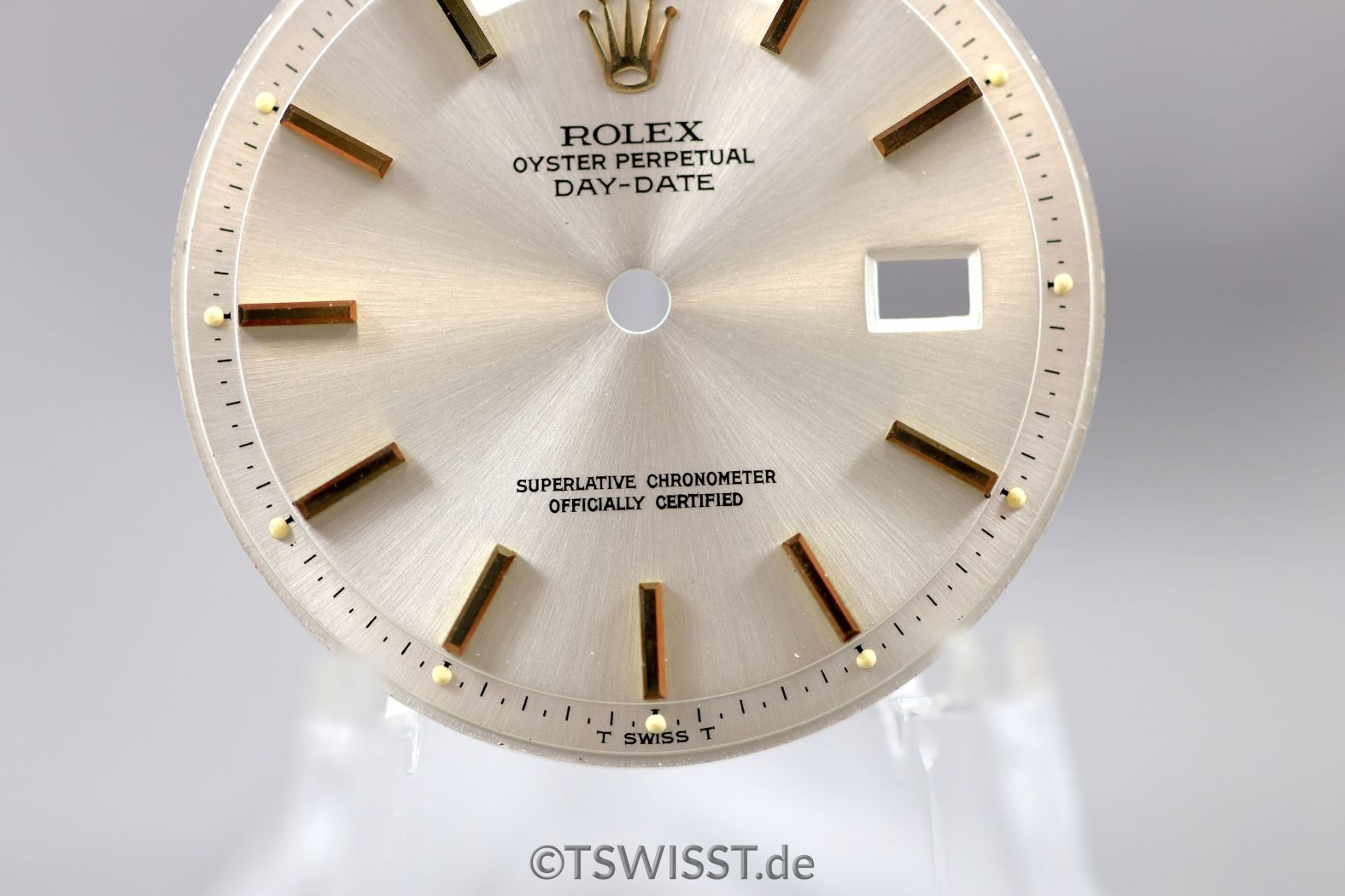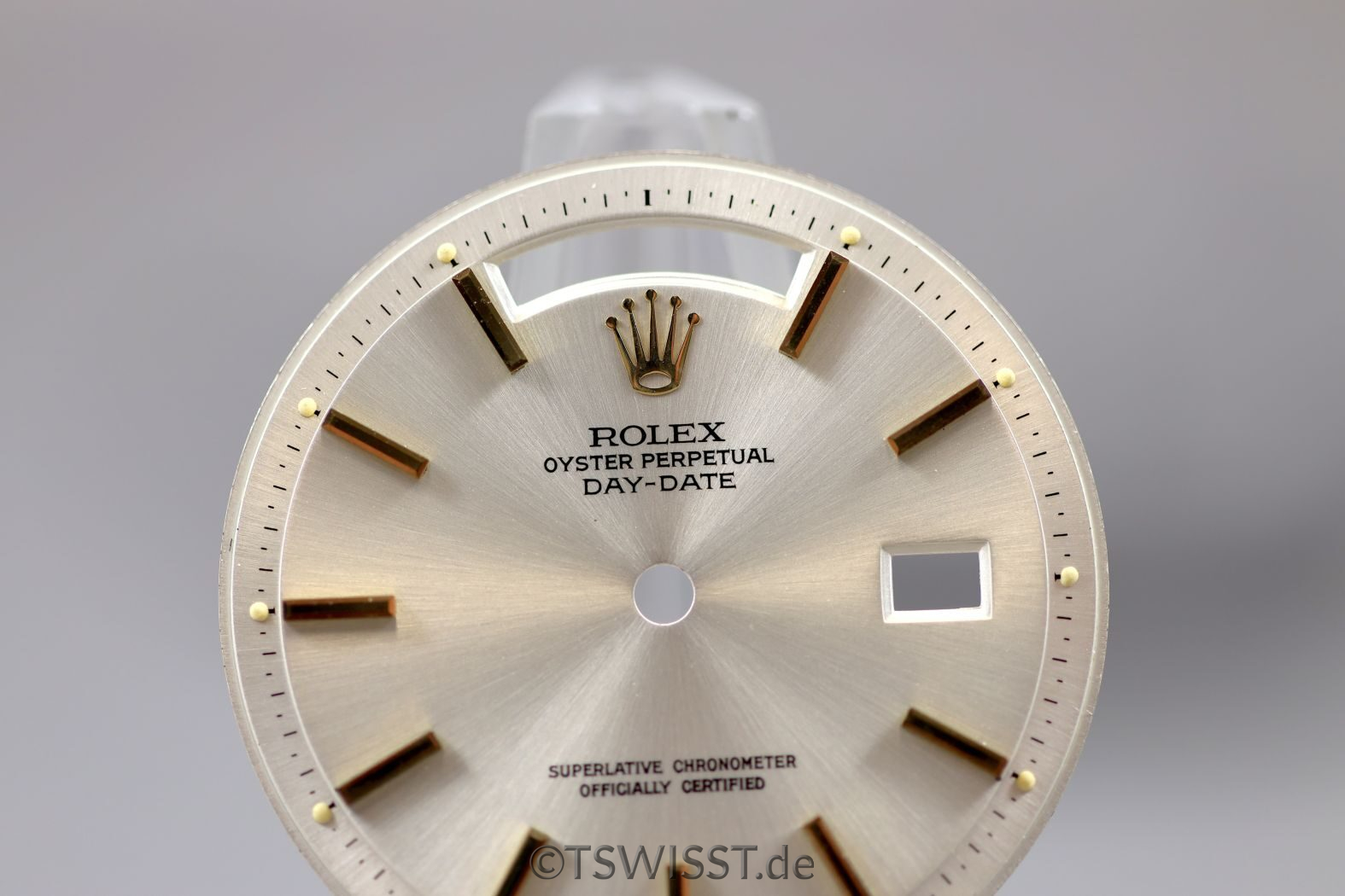 Drop dead gorgeous silver Rolex dial for Day Date 36mm Plexi version like 1803,1807 and other Refs. Yellowgold index, lume is tritium.