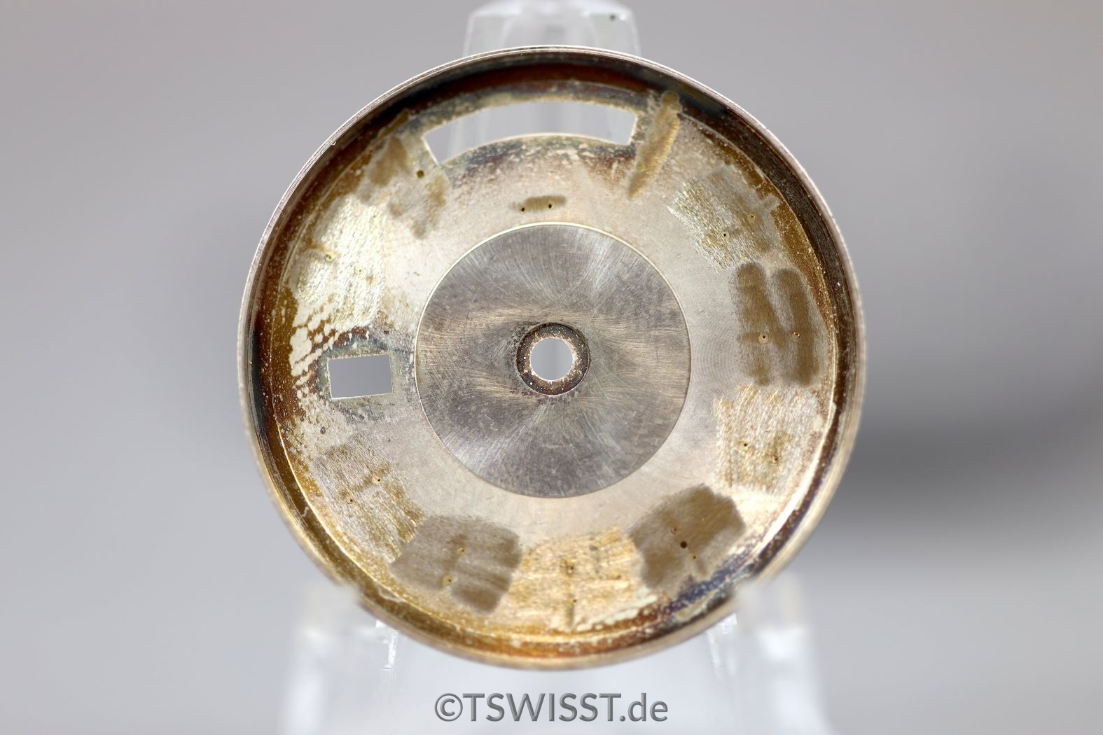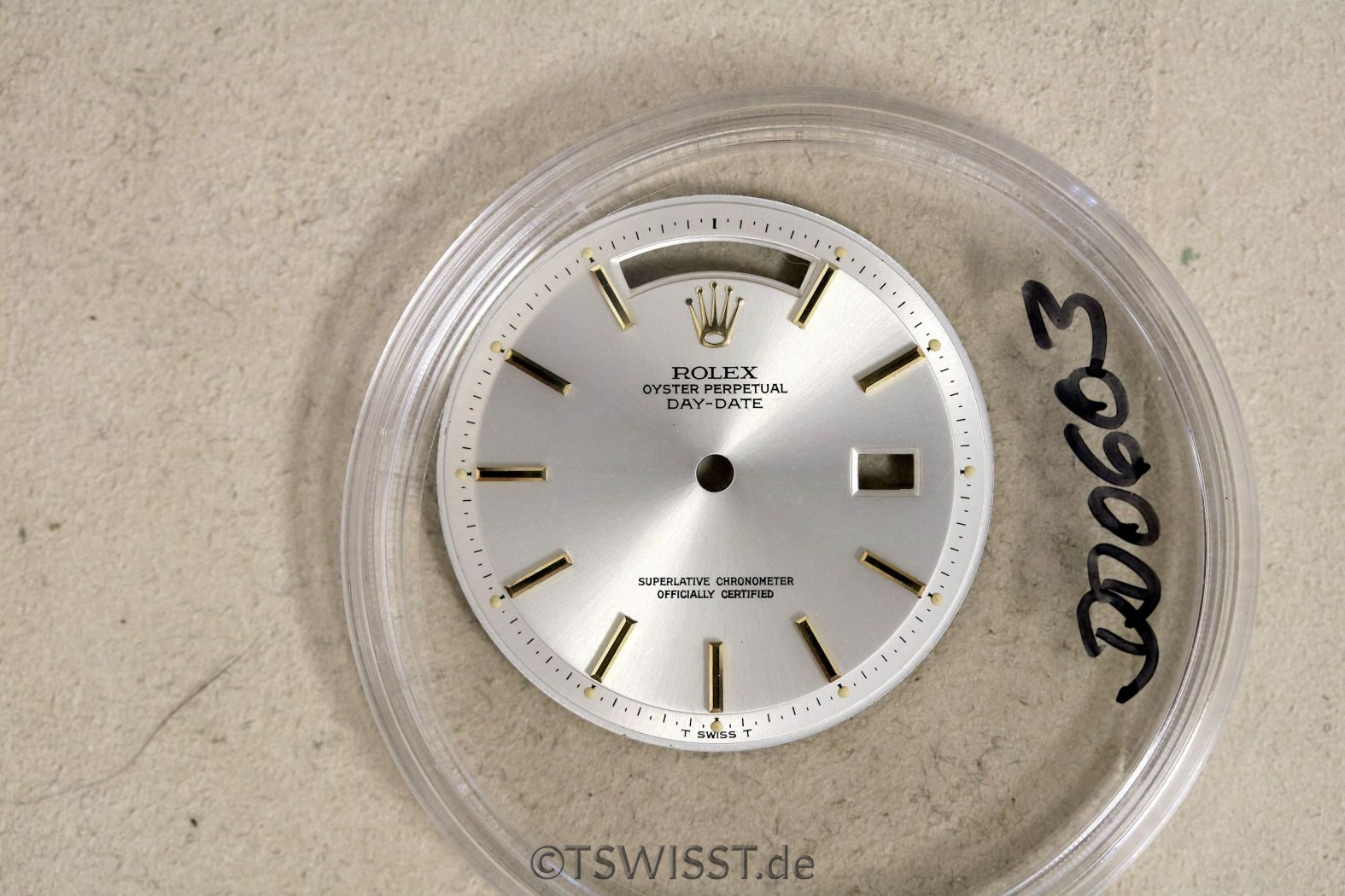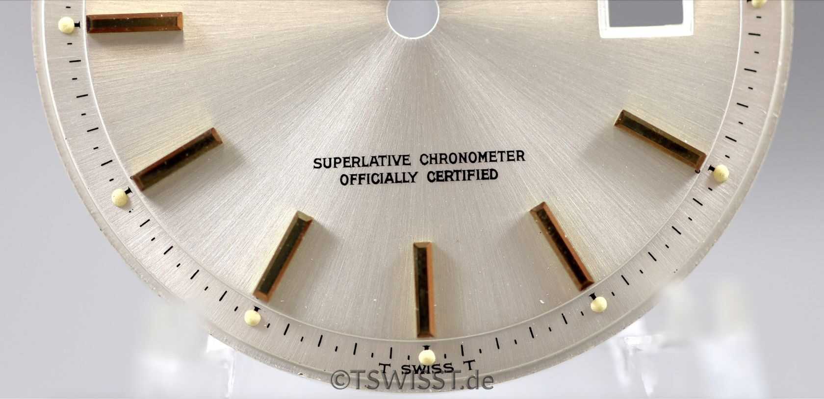 Drop dead gorgeous silver Rolex dial for Day Date 36mm Plexi version like 1803,1807 and other Refs. Yellowgold index, lume is tritium.