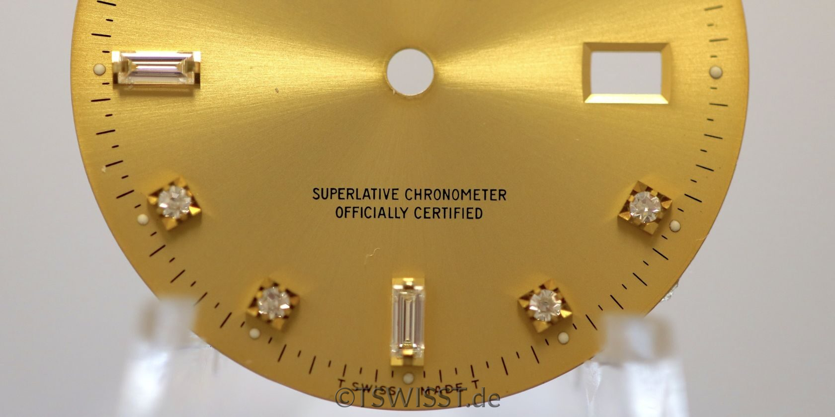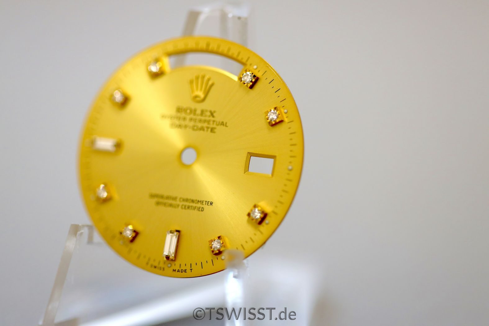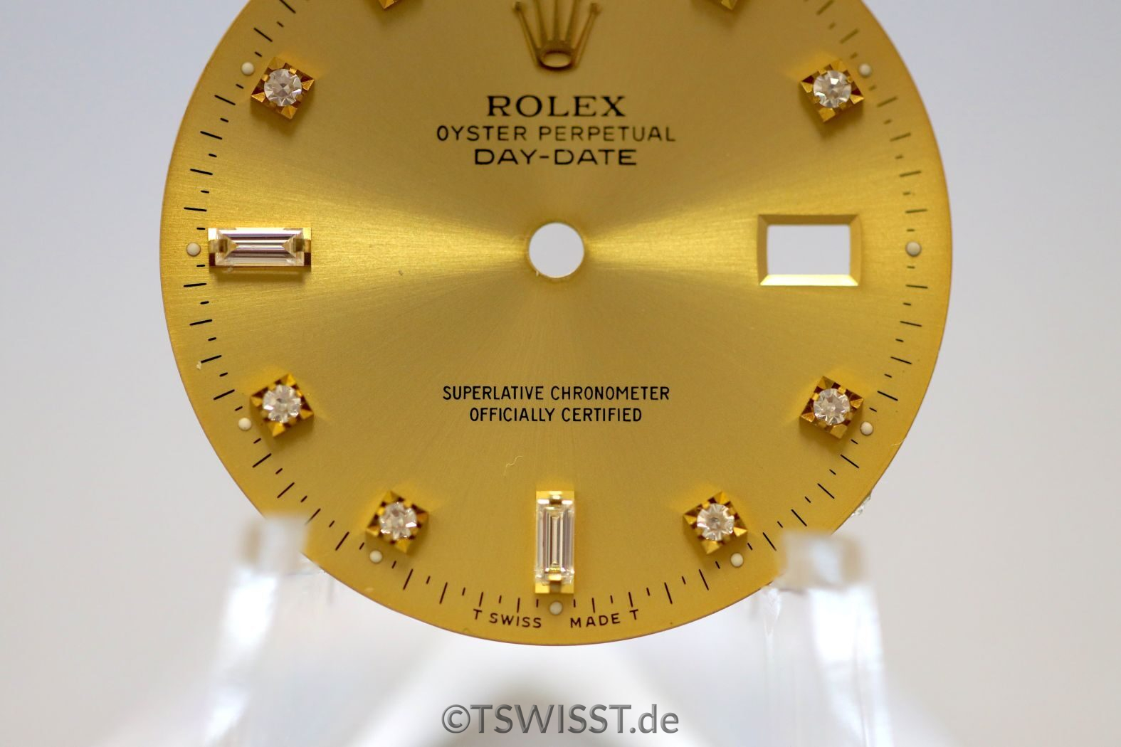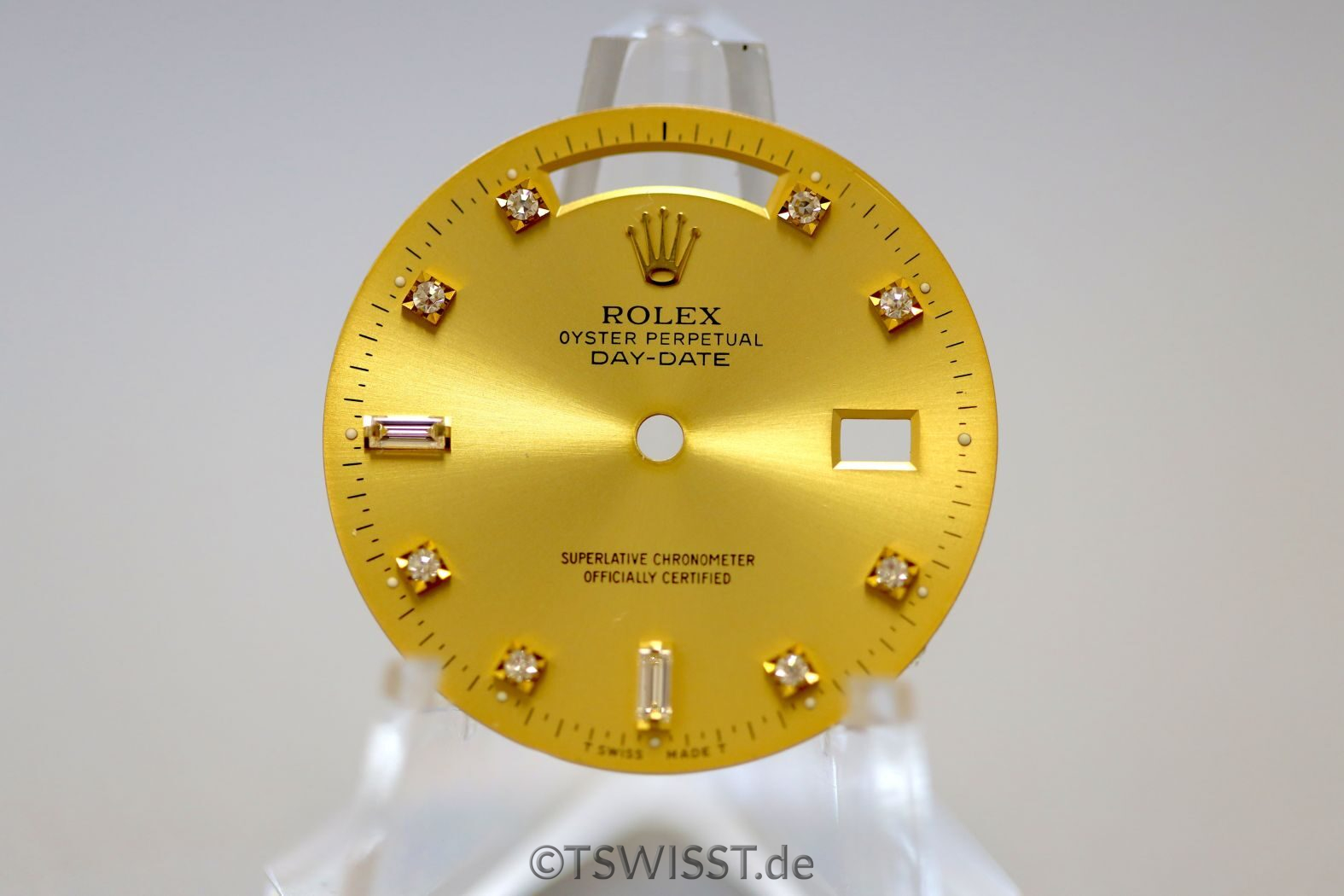 Rolex diamond dial for Day Date 36mm like 18038 and other 5digit refs. Colour changes from gold to orange/lemon, depending on light. Original setting. Lume is tritium. Excellent condition.