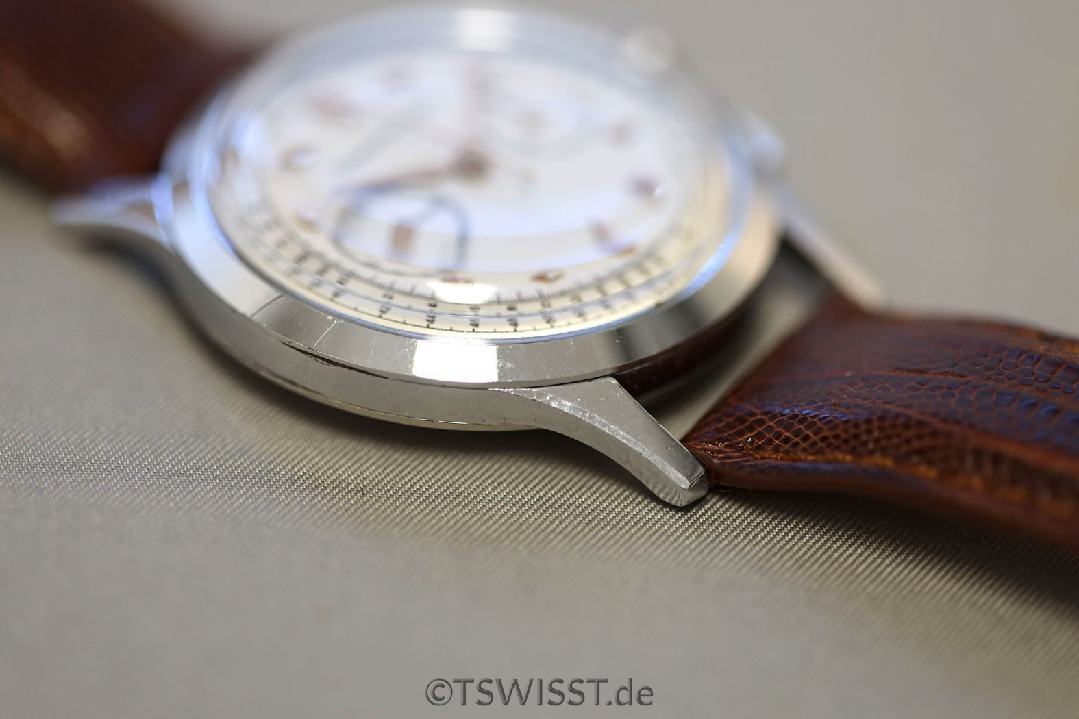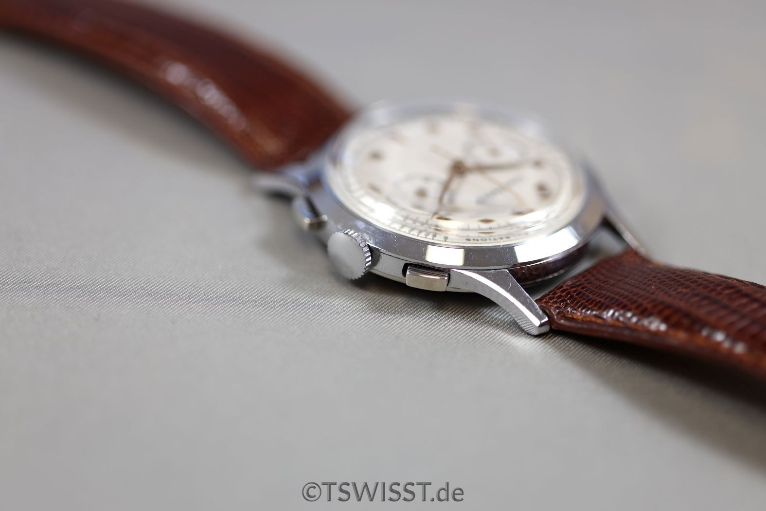 Beautiful Girard-Perregaux chrono with pulsation scale. Dial has a wonderful light patina, case is unpolished and shows no signs of corrosion and only slight traces of wear. Movement is a Excelsior Park EP4, the top version w/o column wheel. Movement runs very good and was just regulated by the watchmaker. Ref is 6556 and serial is 911247. Case has 38mm in diameter and all 20mm straps and bracelets work with it. A gem of a dresswatch.