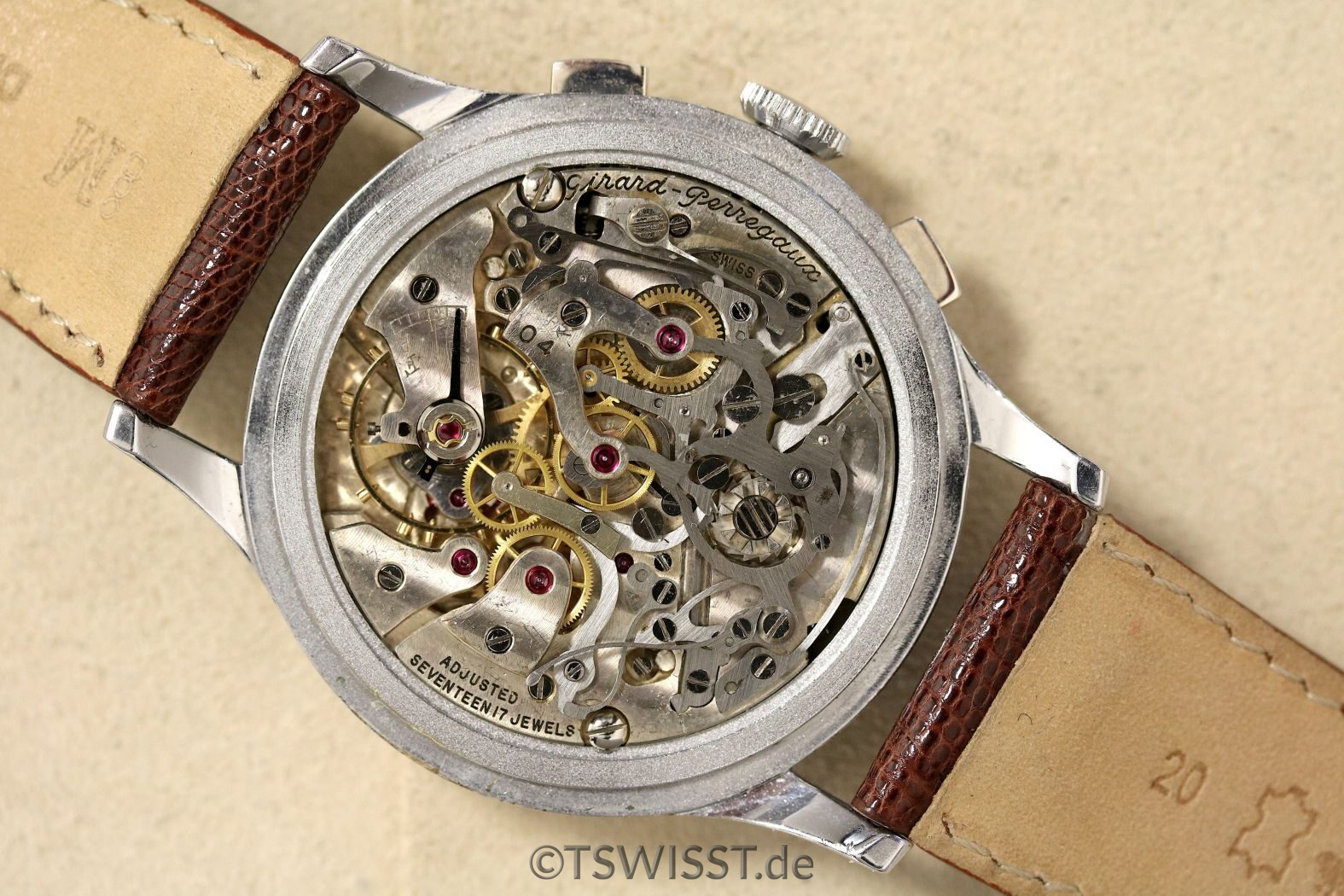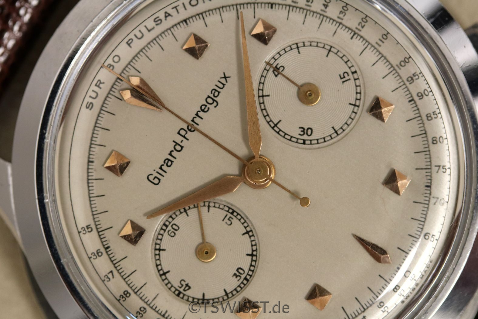 Wunderschöner Girard-Perregaux Chrono mit Pulsations-Skala auf dem Zifferblatt. Eingeschalt ist ein top Werk „Excelsior Park EP4 (Variante ohne Säulenrad), GP gebrandet. Das Blatt weist eine schöne leichte Patina auf, das Case ist unpoliert mit wenig Tragespuren. Im Deckel sind Referenz 6556 und Serial 911247 perfekt lesbar. Keinerlei Korrosion, das Werk läuft top. Die Uhr war gerade beim Uhrmacher für einen Check und Regulierung.